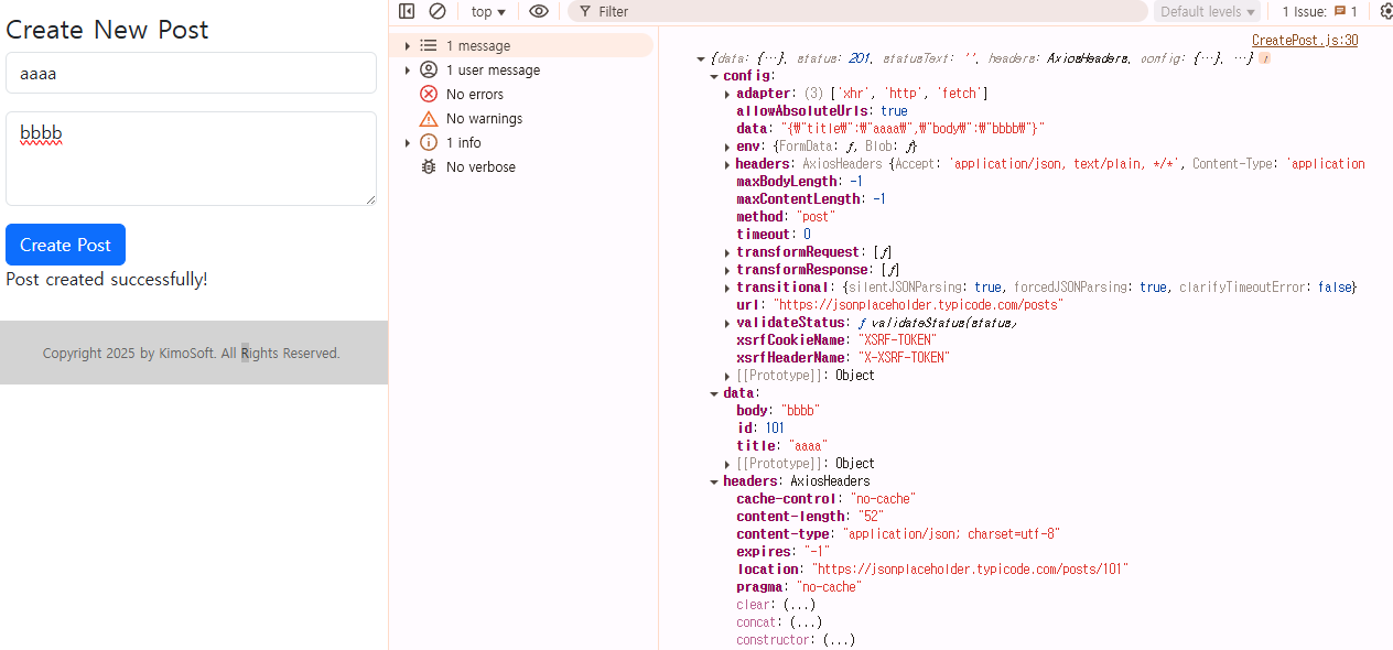 - 응답 처리: 요청 후 성공하면 성공 메시지가 표시됩니다(" Post created successfully! "). 오류가 있으면 오류 메시지가 표시됩니다 (" Error creating post ").
