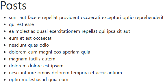 - Conditional Rendering: 데이터가 아직 로드 중이면 "로딩 중..."을 표시합니다. 오류가 발생하면 오류 메시지를 표시합니다. 그렇지 않으면 페치된 데이터에서 게시물 제목 목록을 렌더링합니다.