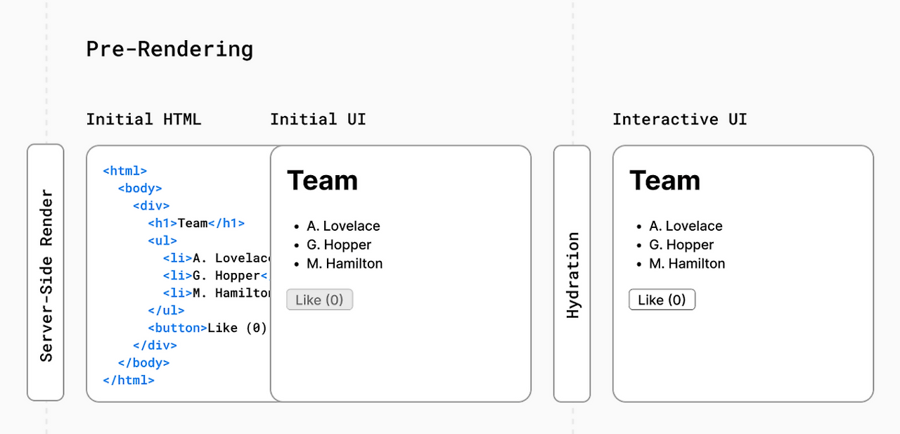 하지만 Next.js는 모든 페이지를 사용자에게 전해지기 전에 미리 렌더링 즉, Pre-Render 한다. 이는 Next.js가 모든 일을 클라이언트 측에서 모든 작업을 수행하는 것이 아니라, 각 페이지의 HTML을 미리 생성하는 것이다.