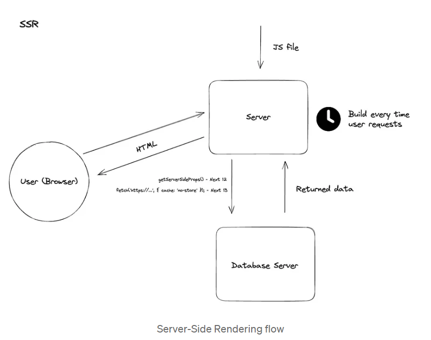 - 유저가 브라우저에서 요청 시마다, 서버가 data를 받아와 html을 렌더링한다.
