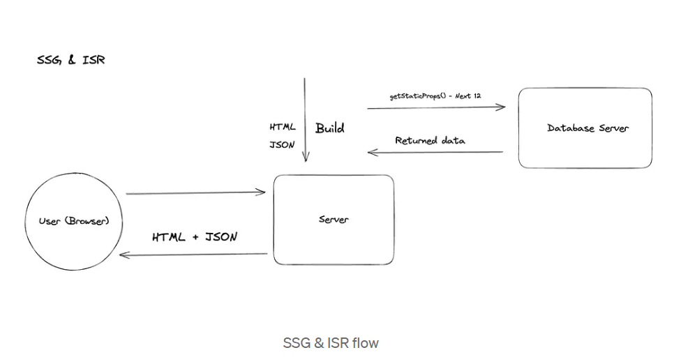 - 유저가 페이지를 요청할 때마다, 빌드 때 만들어놓았던 HTML+JSON이 들어있는 완전한 페이지를 보내준다.