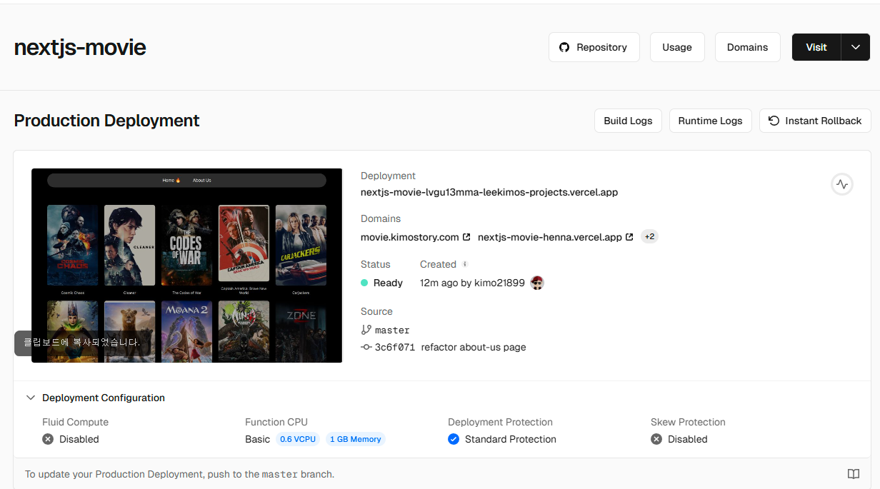 도메인을 클릭하여 사이트에 접속하면 배포된 본인의 프로젝트를 확인할 수 있다.