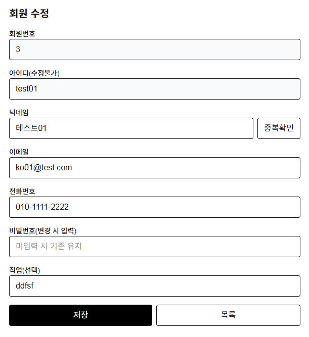 - 비밀번호/비밀번호 확인은 보안상 유지하지 않고, 실패 시 무조건 비움