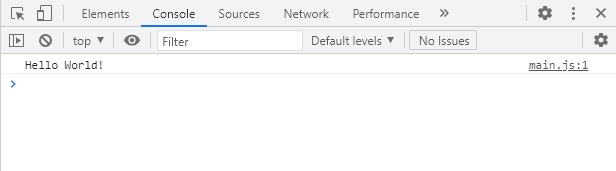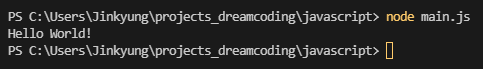 그리고 터미널에서 node main.js 라고 명령어를 실행시키면 Hello World! 가 출력되는 것을 볼 수 있다.