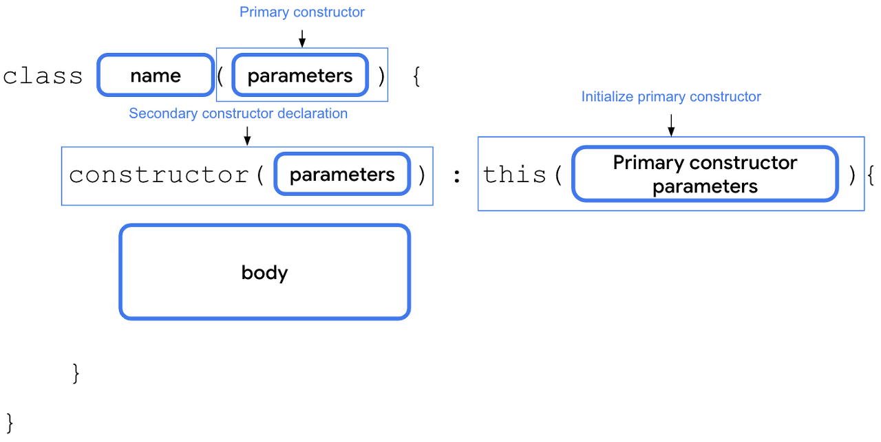 - 보조 생성자 선언. 보조 생성자 정의는 constructor 키워드로 시작하고 그 뒤에 괄호가 나옵니다. 해당하는 경우 괄호에는 보조 생성자에 필요한 매개변수가 포함됩니다.
