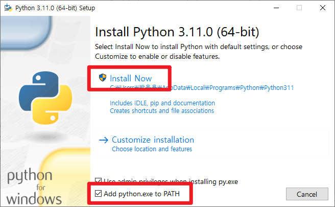 "Add python.exe to PATH" 옵션을 누락하면 이후 실습할 때 오류가 발생할 수 있다.