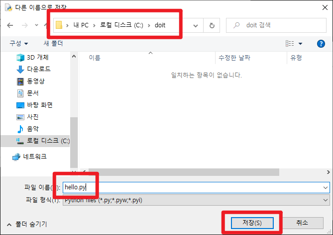 [확인]을 선택하고 C:\doit 디렉터리를 생성한 후 hello.py라는 이름으로 저장한다. 에디터로 파이썬 프로그램을 작성한 후 저장할 때는 파일 이름의 확장자를 항상 .py로 해야 한다. .py는 파이썬 파일임을 알려주는 확장자이다.
