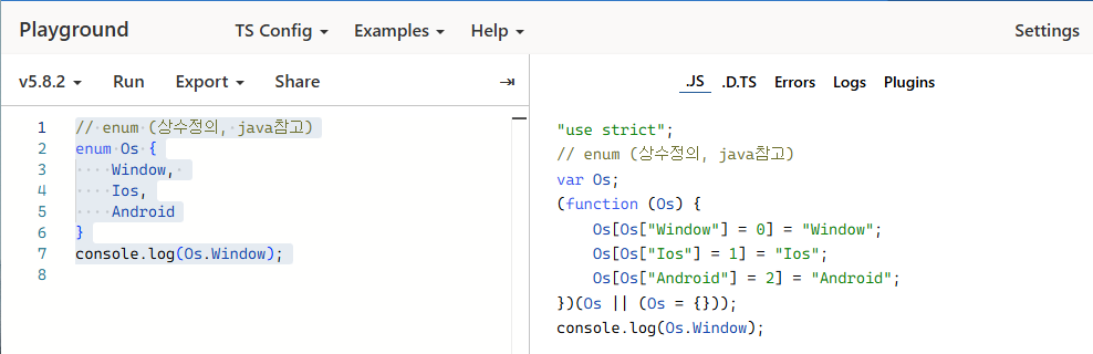 위 페이지에서 ts 파일을 작성하면 우측에 변환된 js 결과를 확인가능