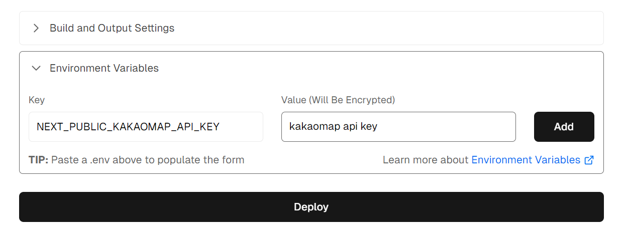 그래서 밑에 사진처럼 Environment Variables 탭에서 본인이 env 파일에 설정한 변수와 API KEY 값을 각각 Key와 Value에 맞게 넣고 Add를 클릭하면 된다.