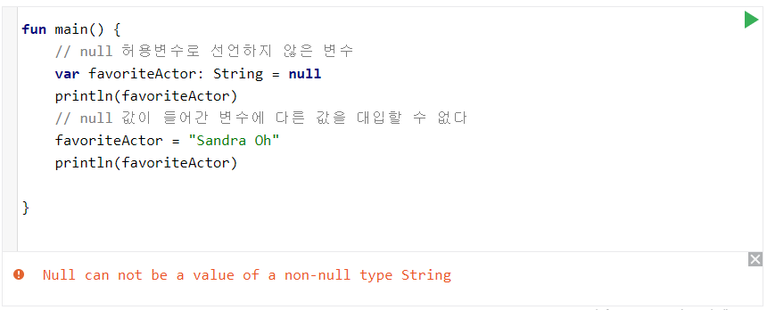 - 좋아하는 배우의 이름에 favoriteActor 변수를 재할당한 후 println() 문에서 ?. 안전 호출 연산자를 null이 아닌 !! 어설션 연산자로 대체합니다.